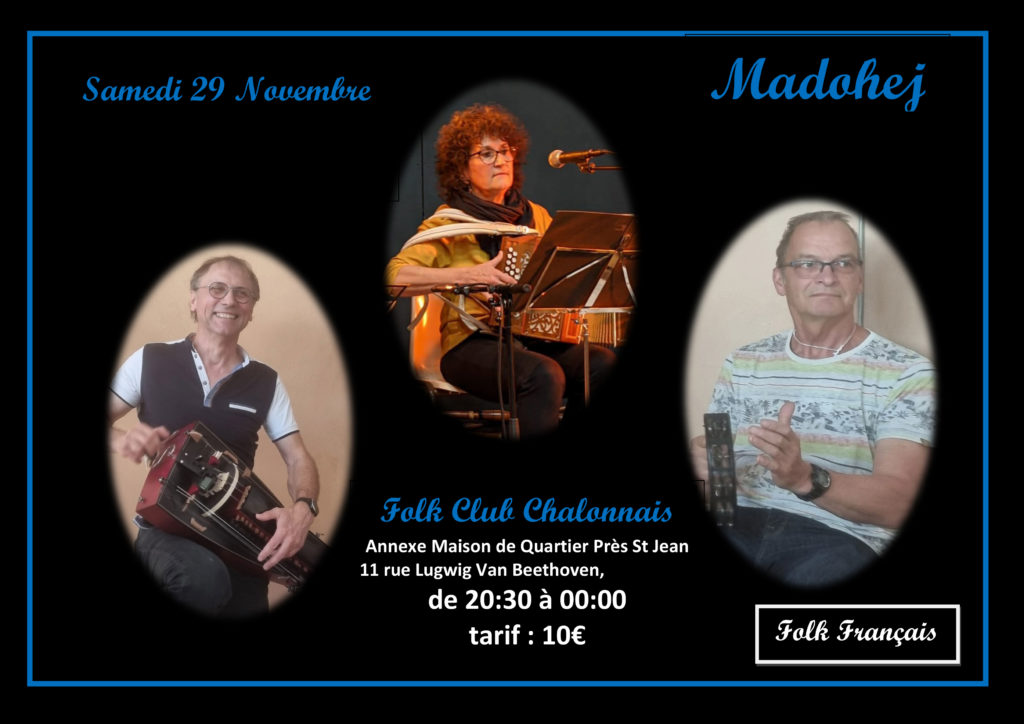- Avec l’Atelier chant trad à danser du CRR de Chalon/S et Les Musiciens du Folk Club, MADOHEJ animera en seconde partie un bal folk organisé par le folk Chalonnais.